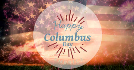 Digital composite image of happy columbus day symbol over american flag and fireworks. discovery and identity.