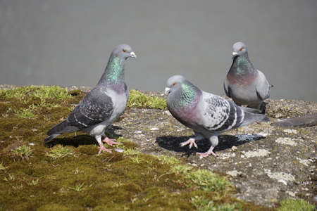 Feral pigeon, common grey city dove, birds in the city up close, urban birds group simple closeup, detail. Animals up close, city fauna concept, nobody, side view, outdoors scene