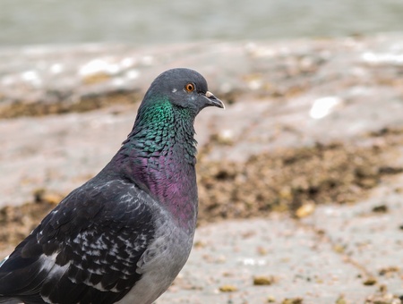 A pigeon walks on a stone pebble by the sea. Close-up