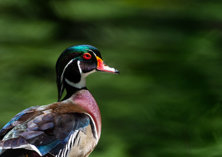 Beautiful Wood Duck, Aix sponsa, in sunlight with green water in background.