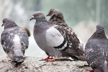 Pigeons in a city. concept of dirty hungry birds in the town
