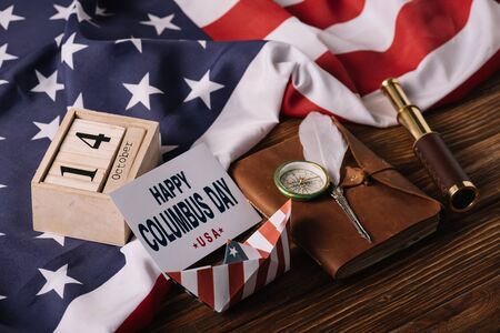 card with happy Columbus Day inscription near calendar, paper boat, nib, compass, telescope and notebook on wooden surface with American national flag