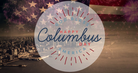 Multiple exposure of columbus day symbol over american flag and coastal city. digital composite of symbol, identity and discovery