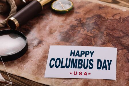 card with happy Columbus Day inscription near compass and magnifying glass on old world map
