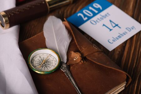 calendar with October 14 date near leather notebook with nib and compass on wooden surface