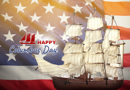 Happy Columbus Day. Beautiful ship model and American flag