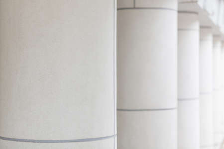 Pillars in a row. Classic columns white marble, Justice building, court entrance colonnade, close up view