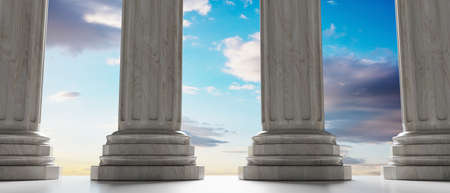 Pillar in a row, colonnade on sky at sunrise background. Marble stone column, courthouse building architectural detail. 3d illustration