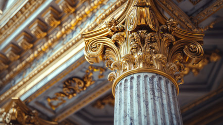 An ornate marble column with intricate golden Corinthian capital details, showcasing luxurious classical architecture