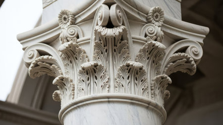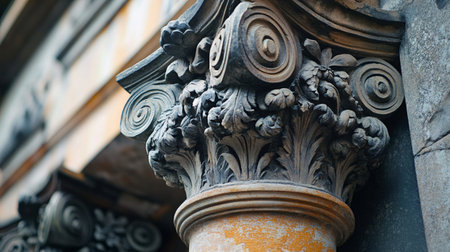 Architectural detail featuring elaborate carvings on a column capital, highlighting floral patterns and spiral motifs