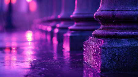 This captivating image features wet pavement at night, beautifully reflecting colorful ambient lights. The purple hues create a serene urban atmosphere perfect for artistic projects.