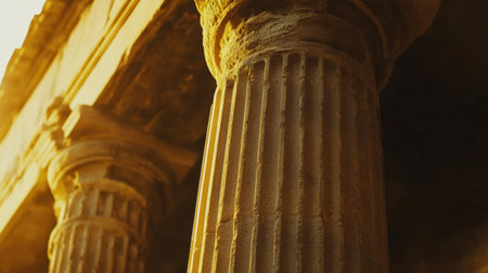 The image captures a close-up view of majestic ancient columns, highlighting their ornate bases and textured surfaces. The warm tones and soft shadows evoke a sense of history and grandeur, inviting viewers to appreciate the artistry of classical architecture.