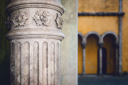 Sintra, Portugal - February 4, 2019: Exterior view of the Pena Palace, famous colorful castle in Sintra, Portugal, on february 4, 2019. Detail of the entrance columns decorations