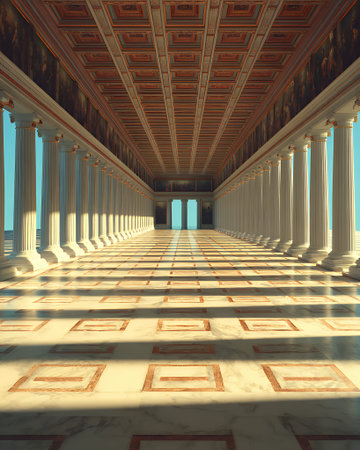 Greek inspired interior with marble columns embodying tradition and strength in a colonnade