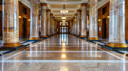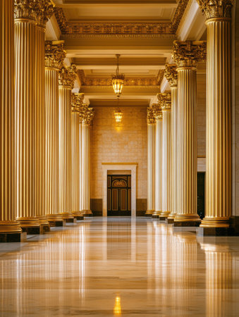Elegant golden columns line the hallway of a prestigious government building, illuminated by tasteful lighting that enhances the opulent atmosphere.