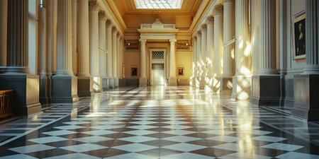 A hallway with neoclassical columns and a checkered floor showcasing symmetry and balance, Explore the use of symmetry and balance in neoclassical architecture to create harmonious compositions