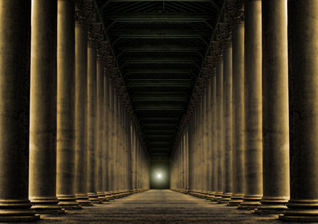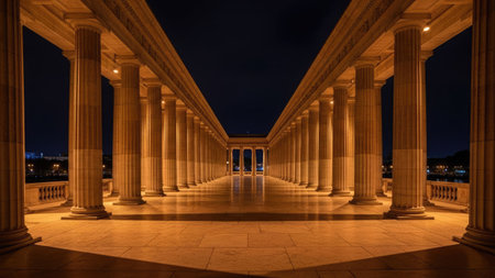 A nighttime view showcases a long perspective of columns. Warm tones illuminate the stone structure under a dark sky. The symmetrical composition emphasizes the repeating architectural elements. This image is suitable for various commercial uses, including artistic prints and architectural documentation.