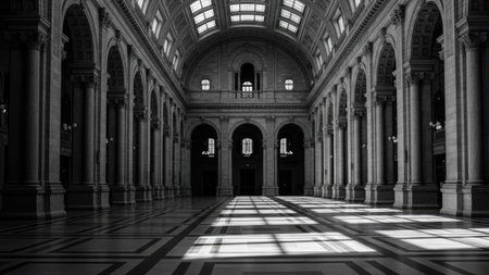 Architectural interior view featuring rows of fluted columns, creating a symmetrical perspective. Sunlight streams across the scene, highlighting the textures and forms, while deep shadows define the space. The composition suggests a historic or governmental setting, suitable for various editorial and commercial applications.