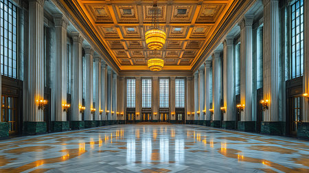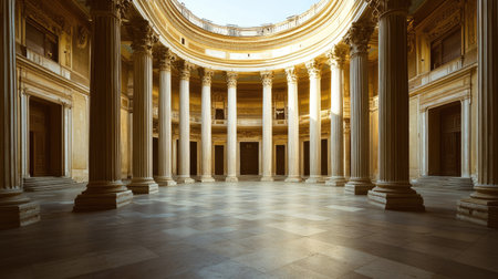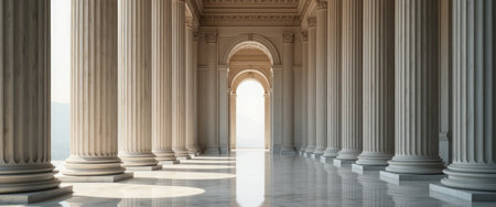 A grand hall adorned with towering columns stretches into the distance, bathed in soft, golden light that filters through an archway. The polished marble floor reflects the elegance of the architecture, creating a tranquil atmosphere that invites contemplation and awe.
