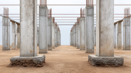 Close-up view of sturdy concrete pillars under construction, highlighting the essential support structures in an urban building project, featuring raw materials and craftsmanship.