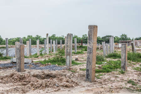 Photo of construction metal rods in concrete pillars against the background of a construction site on the street.