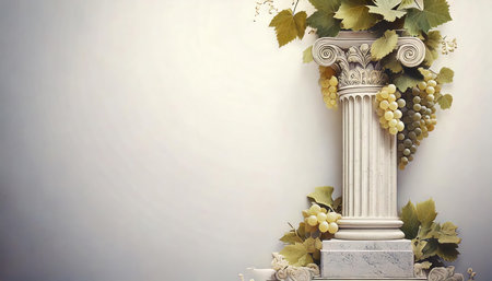 Vintage background with copy space, white marble column and grapes.
