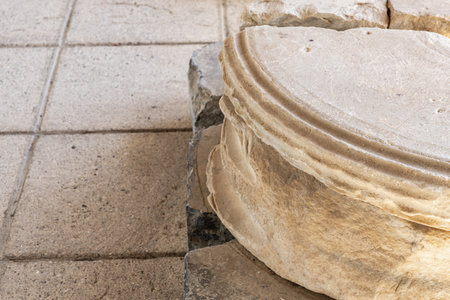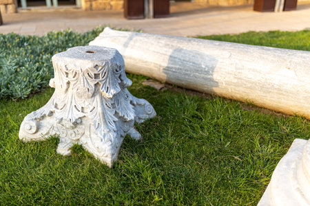 CAESAREA, Israel - August 2022, capital of column in Caesarea National Park - Ruins of ancient city built by Herod. an exceptional archaeological site of the Roman and Crusader period