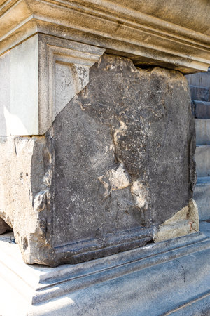 Garni, Armenia - September 30, 2023: relief of Atlas holding sky on stone at square pedestal of ancient Greco-Roman Temple of Garni in Armenia