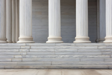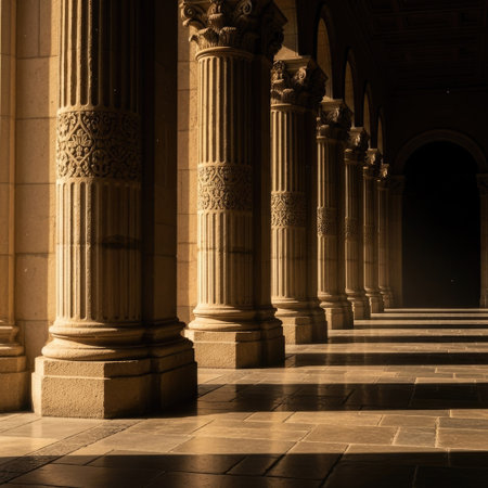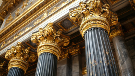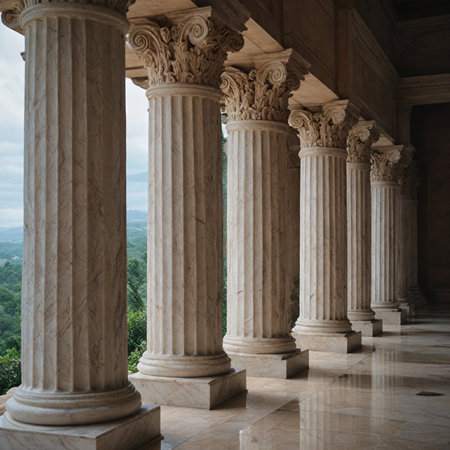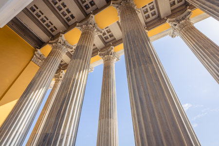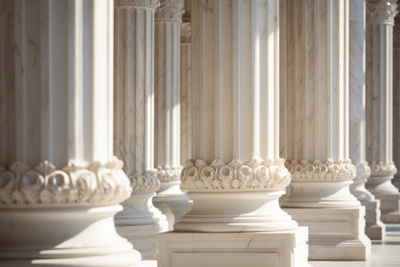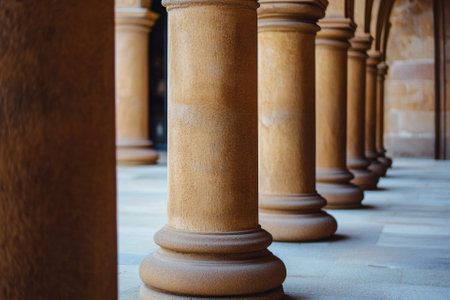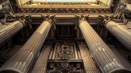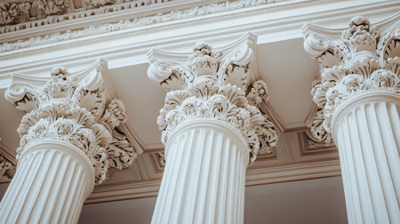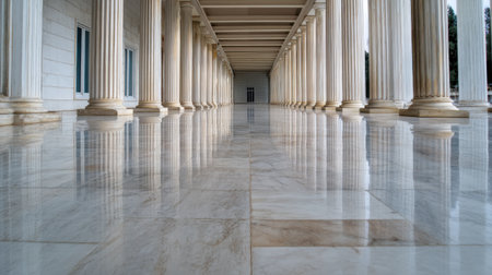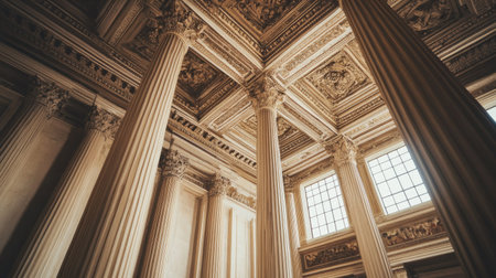 Majestic classical columns in a historic building. Symmetric architectural perspective with soft light. ideal for cultural and architectural themes