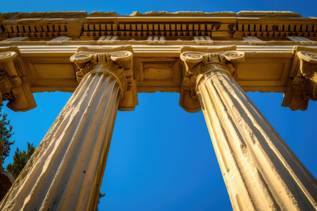 The image captures a close-up view of majestic ancient columns, highlighting their ornate bases and textured surfaces. The warm tones and soft shadows evoke a sense of history and grandeur, inviting viewers to appreciate the artistry of classical architecture.