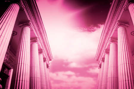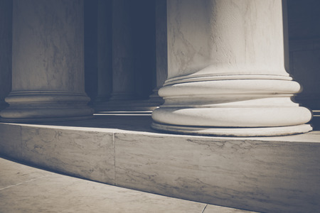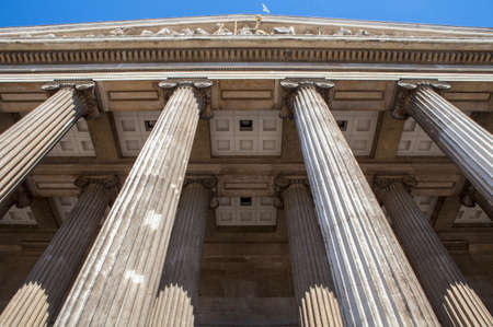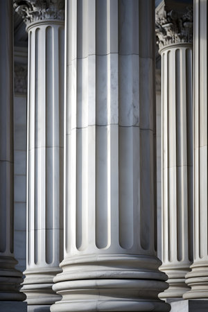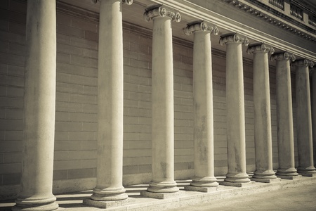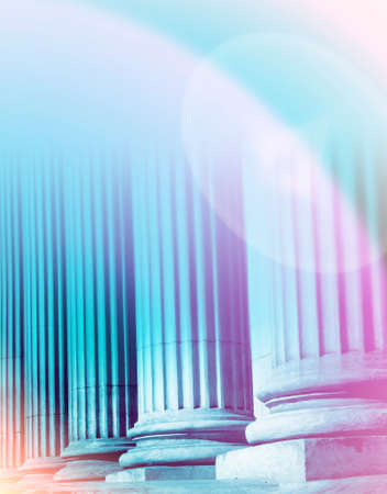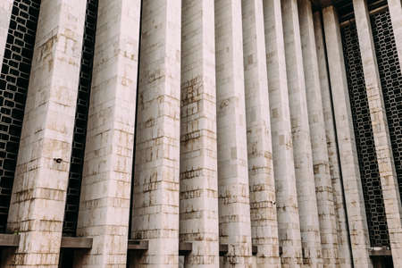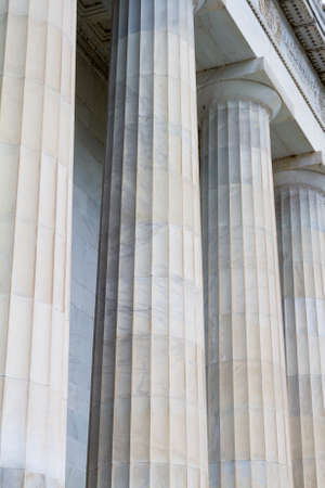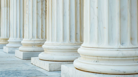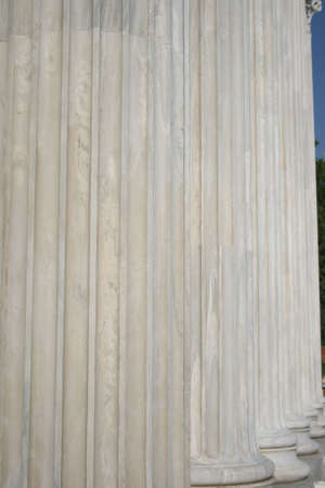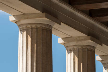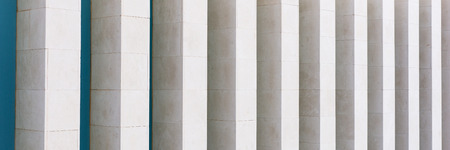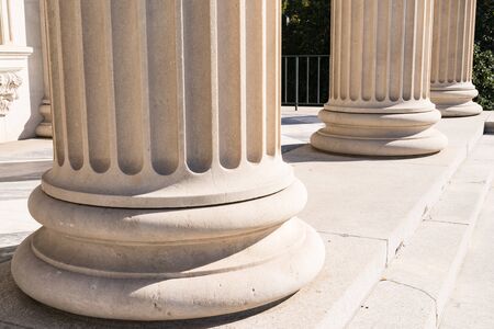 Pillars in a row. Classic columns white marble, Justice building, court entrance colonnade, close up view