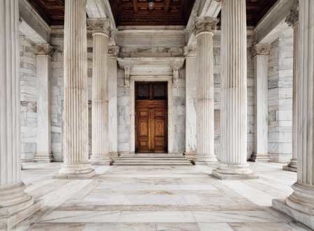 An imposing architectural composition showcases a colonnaded entrance featuring marble flooring. Tall, fluted columns support the structure, leading to a wooden door. The interplay of light and shadow highlights the textures. Suitable for illustrating history, design, or cultural themes, and suitable for a variety of media uses.