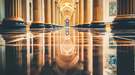 Polished marble floor inside a grand hall, showcasing numerous columns. The reflections of the columns on the floor are very clear and detailed. The light is warm and golden, casting an appealing ambience on the scene. The hall is characterized by symmetry and its architectural grandeur.