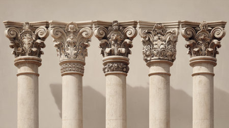 Balanced arrangement of five classical stone columns, intricate capitals and shafts, minimal neutral background with soft daylight