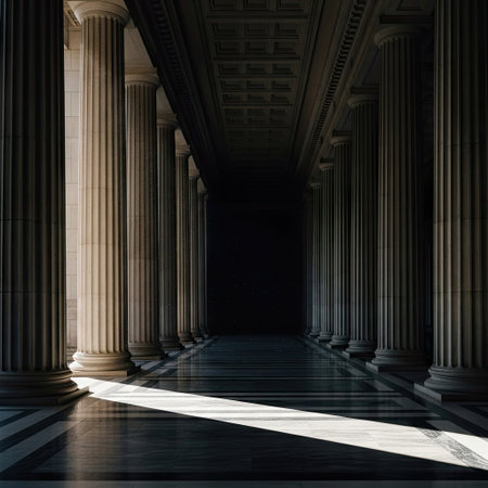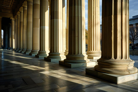 Architectural interior view featuring rows of fluted columns, creating a symmetrical perspective. Sunlight streams across the scene, highlighting the textures and forms, while deep shadows define the space. The composition suggests a historic or governmental setting, suitable for various editorial and commercial applications.