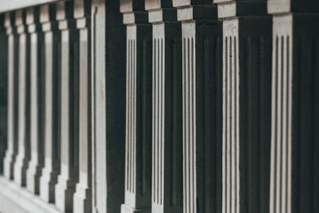 Grey concrete balustrade forming pattern, vintage retro architectural feature, selective focus