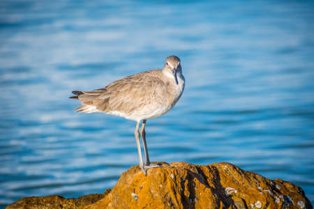 willet looking back at the water on a sunny day at the beach