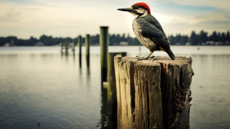 a wooden post near the waterfront, captured in a naturalistic style reminiscent of bird portraits by peter paul rubens and rogier van der weyden. the photograph showcases dark gray and red tones, taken with a canon af35m camera. the image features characterful animal portraits with sharp focus. ai generated