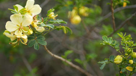 Yellow senna flower in garden, California USA. Cassia candlewood springtime pure bloom, romantic botanical atmosphere, delicate tender blossom. Spring light colors. Soft blur freshness of calm morning