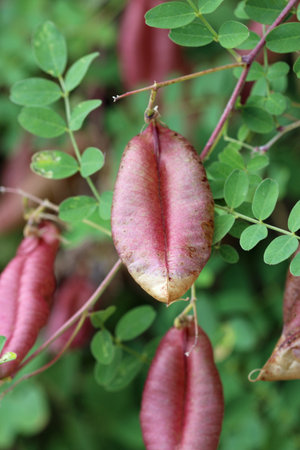 Bladder senna plant, Colutea arborescens, seed pods in close up with a blurred background of leaves.