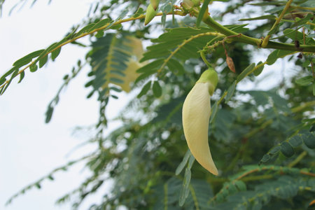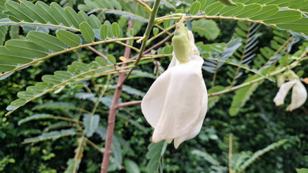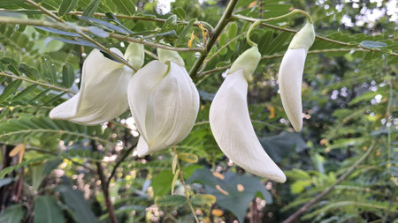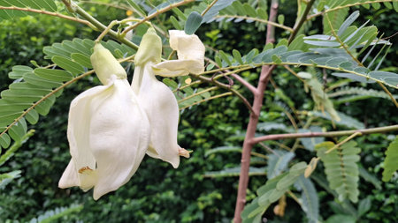 Graceful White Sesbania grandiflora flowers cascade downwards from a tree branch, their elegant form beautifully contrasted by the surrounding green foliage