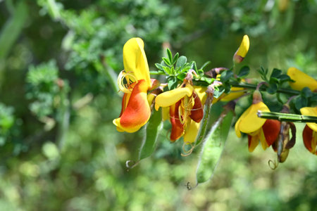 Cytisus scoparius 'Andreanus' (Common broom) flowers. A Fabaceae shrub, it produces butterfly-shaped yellow flowers with red spots on the wing petals in early summer.