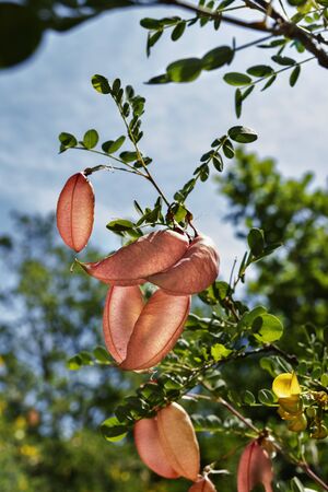 Beautiful branch of colutea arborescens tree -bladder senna- with several inflated seed pod against the blue sky , it’s a sunny day