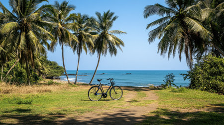 A peaceful coastal landscape featuring a bicycle parked along a sandy path, framed by swaying palm trees and a stunning blue ocean view, perfect for outdoor adventures.