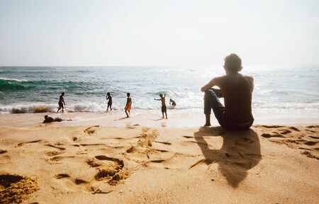 GALLE, SRI LANKA - Feb 15, 2019: Group of friends at the beach watching sunset
