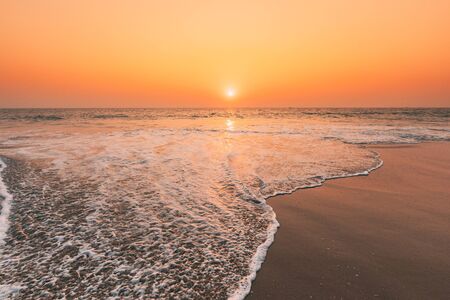 Sunset Sun Above Sea. Natural Sunrise Sky Warm Colors Over Ripple Sea. Ocean Water Foam Washing Sandy Beach At Sunset.