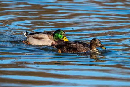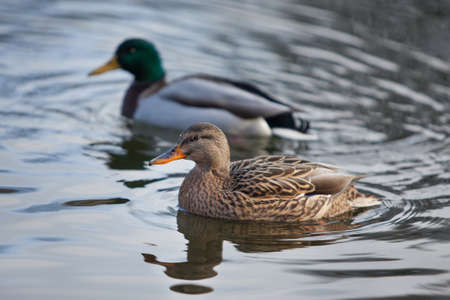 A couple of mallard ducks swim in the river. Mallard ducks, latin name Anas platyrhynchos, male and female