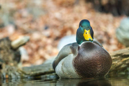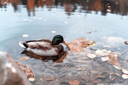 Wild duck in mountain lake. Mountain lake landscape. Beautiful autumn nature background for any purposes.