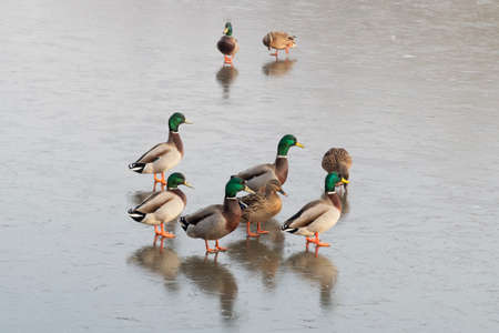 A small group of male and female Mallard ducks standing on the frozen surface of a lake