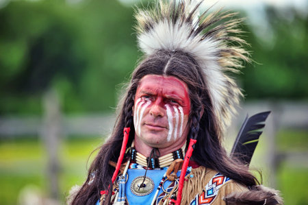 portrait of handsome american indian man in traditional clothes
